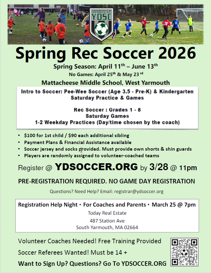 Each team (Grades 1 through 8) practices 1-2 times per a week at a local field in Dennis or Yarmouth. Teams will be assigned a practice slot by the Recreation Director based upon your coach’s practice request and field availability.